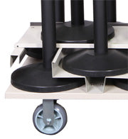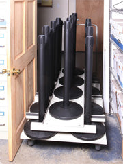 Der Vertikale Pfostenlagerwagen hat eine Kapazität von 18 Pfosten und ist für müheloses Beladen, Bewegen und Lagern von Absperrpfosten konzipiert. Das „Low-Lift“-Design bedeutet, dass die Pfosten nur 13”/330mm angehoben werden müssen, um geladen zu werden. Pfosten mit einem Durchmesser von 2”/50mm, 2,5”/64mm oder 3”/76mm können aufgrund des vertikalen „stehenden Pfosten“-Lagerdesigns auf diesem Wagen untergebracht werden. Eine Breite von 32”/813mm und eine beladene Höhe von nur 51”/1295mm ermöglichen es dem Vertikalen Lagerwagen, durch Standardtüren zu passen.
