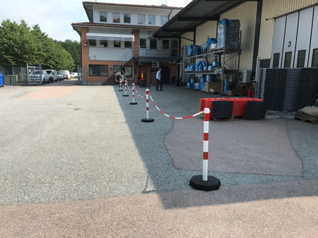 - Vielseitiges Pfosten- und Kettenbarrieresystem ist einfach einzurichten, während das rot/weiße Farbschema die Aufmerksamkeit von Fußgängern und Autofahrern gleichermaßen auf sich zieht