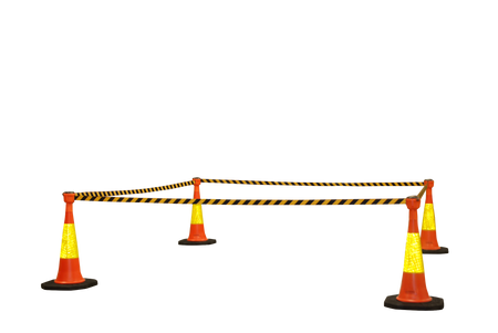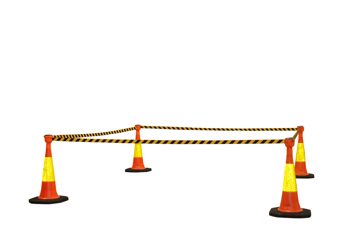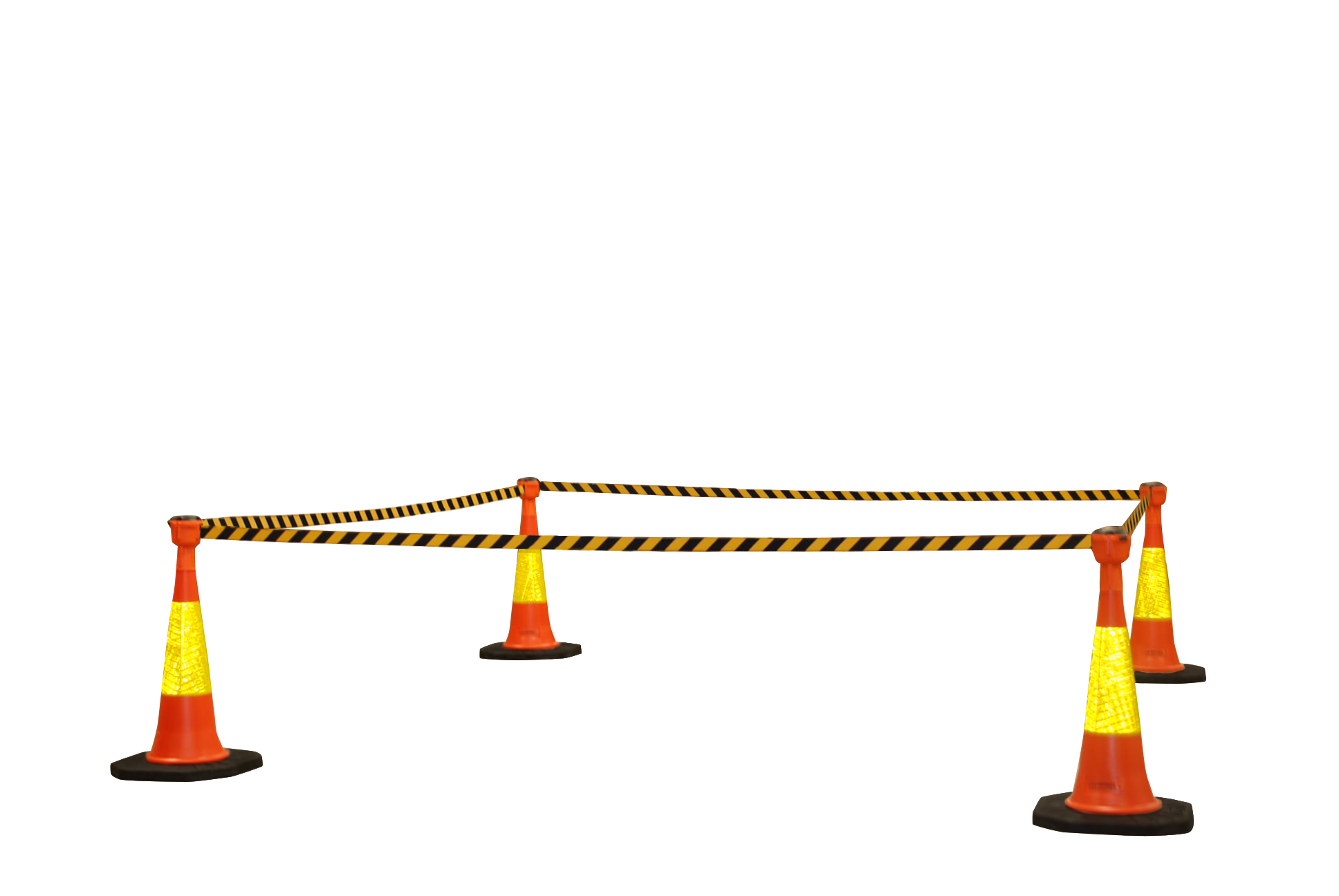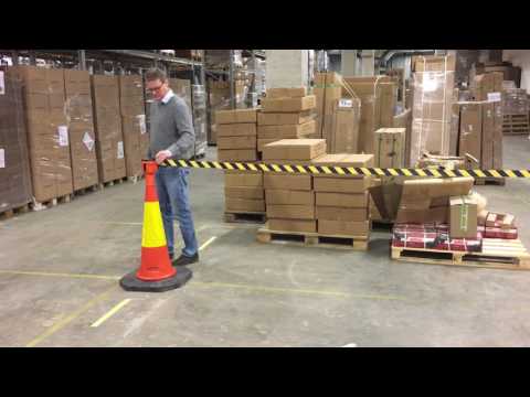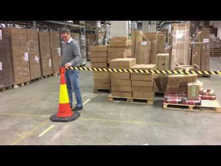 Ein komplettes Absperrpaket vom Modell Basic Signal, bestehend aus 4 Kunststoffpfosten mit einem 3m einziehbaren Gurt und einem schweren Gummifuß.