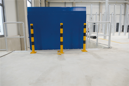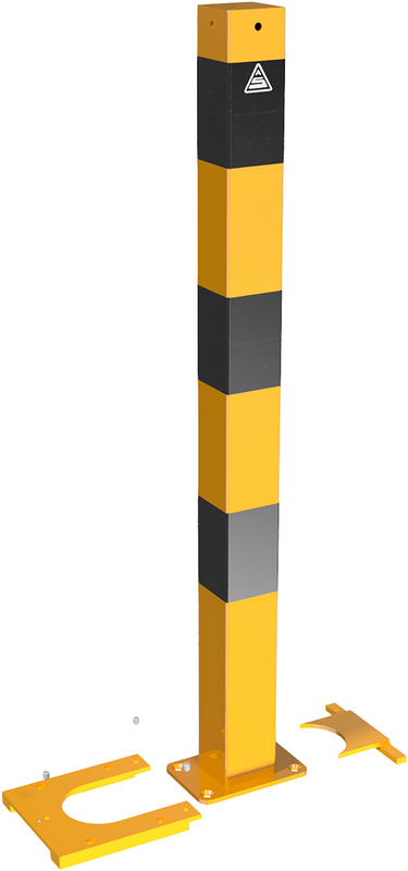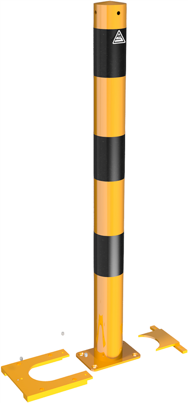 Dieser gelbe Pfosten mit schwarzen Streifen markiert Gefahrenzonen und sperrt Bereiche ab, die frei von Verkehr gehalten werden sollen. Der Pfosten wird von vorne mit einem T-förmigen Stück an der festen Bodenplatte befestigt. Er kann jedoch bei Bedarf leicht ausgetauscht werden, da nur die Bodenplatte dauerhaft am Boden befestigt ist, nicht der Pfosten selbst.