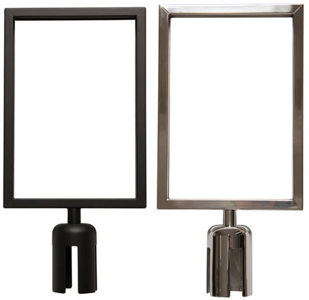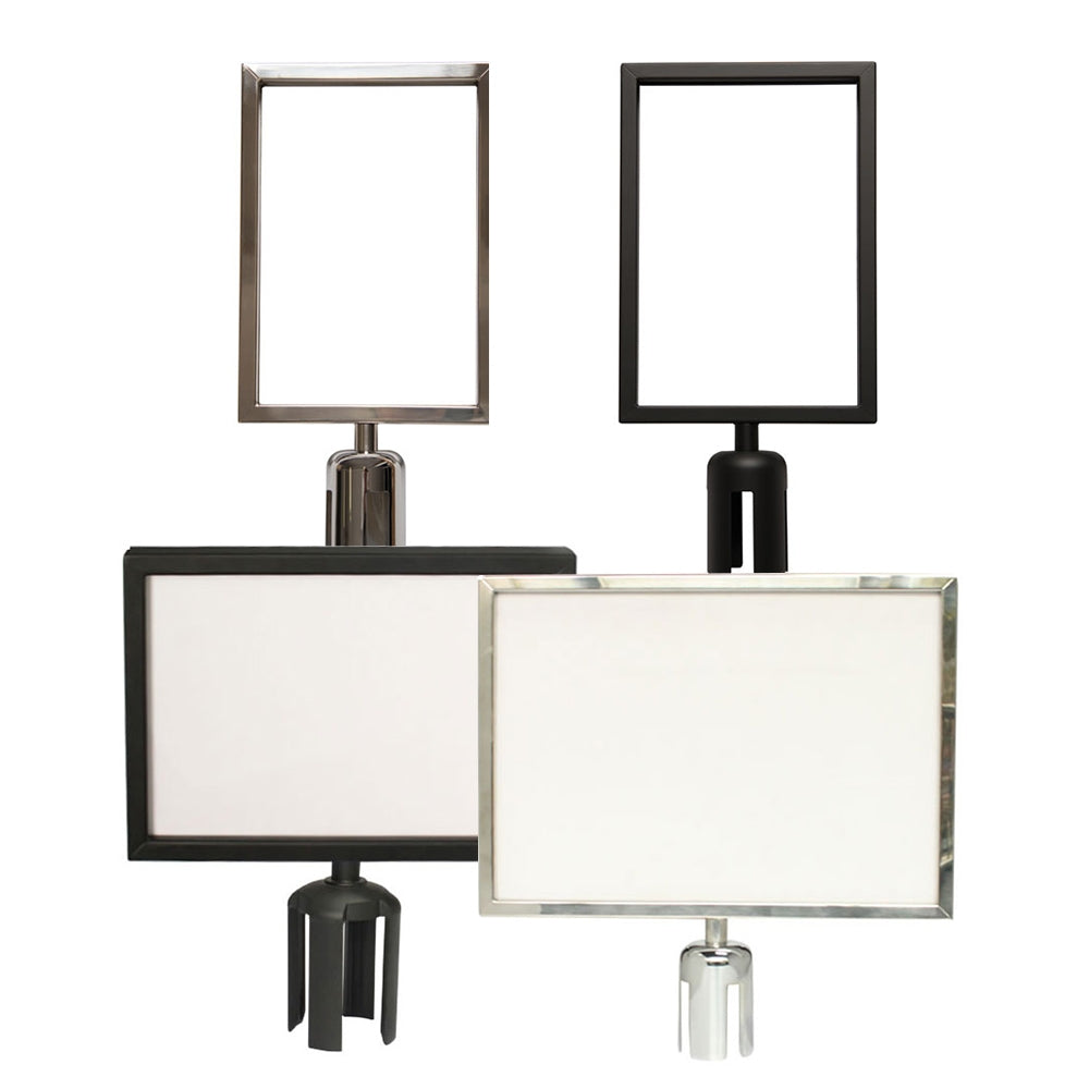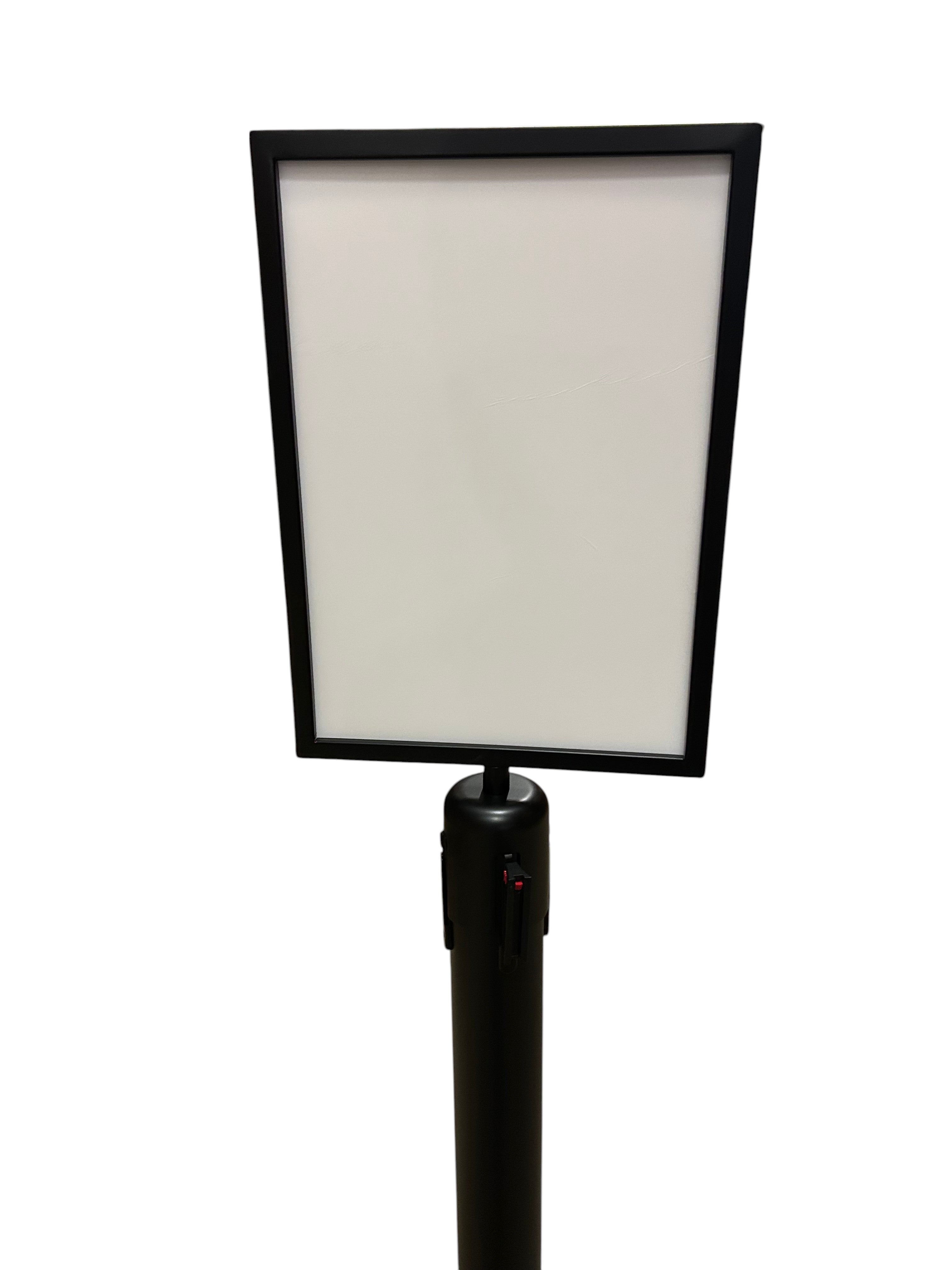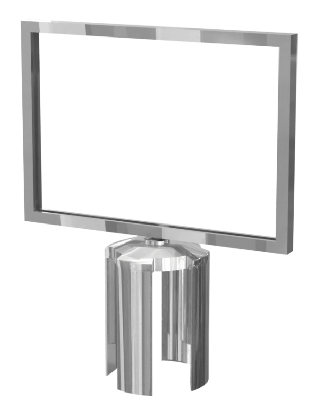 Rahmen für einziehbare Gurtbarrieren sind mit einem Pfostenoberteil-Adapter ausgestattet, der über die Oberseite des Pfostens geschoben wird, um einen festen Sitz zu gewährleisten. Rahmen für Seilabsperrungen sind mit einem Bolzen ausgestattet und werden direkt in das Gewindeoberteil der Absperrung geschraubt. Adapter und Bolzen sind für alle großen Marken von Absperrungen erhältlich.