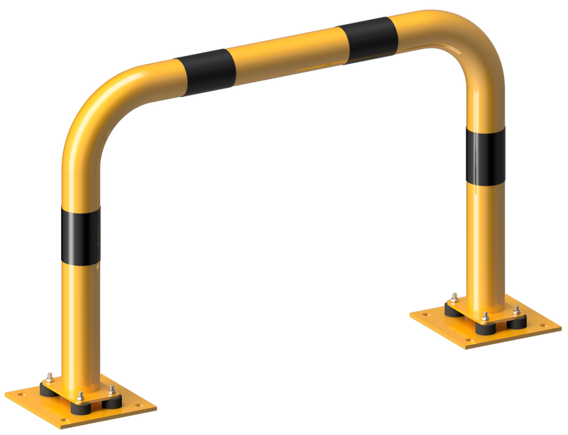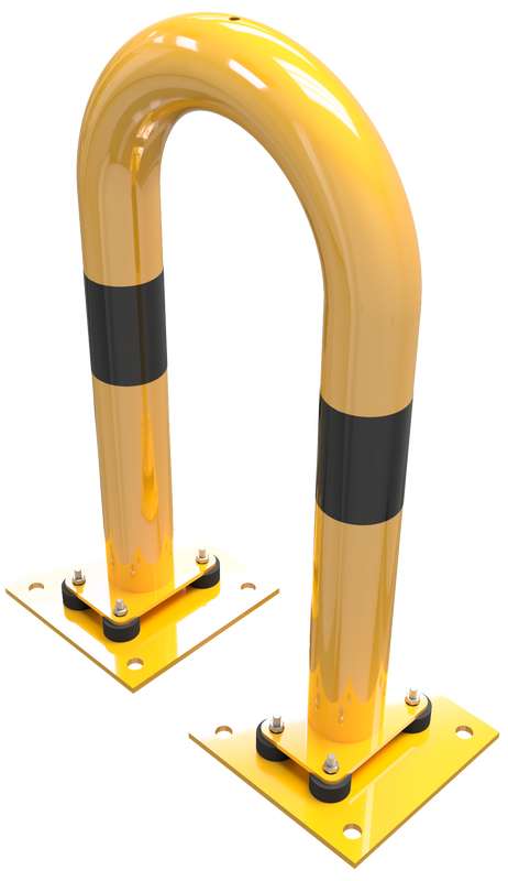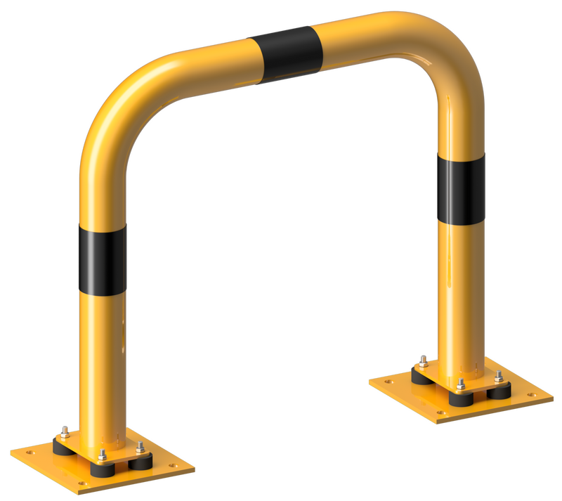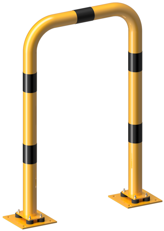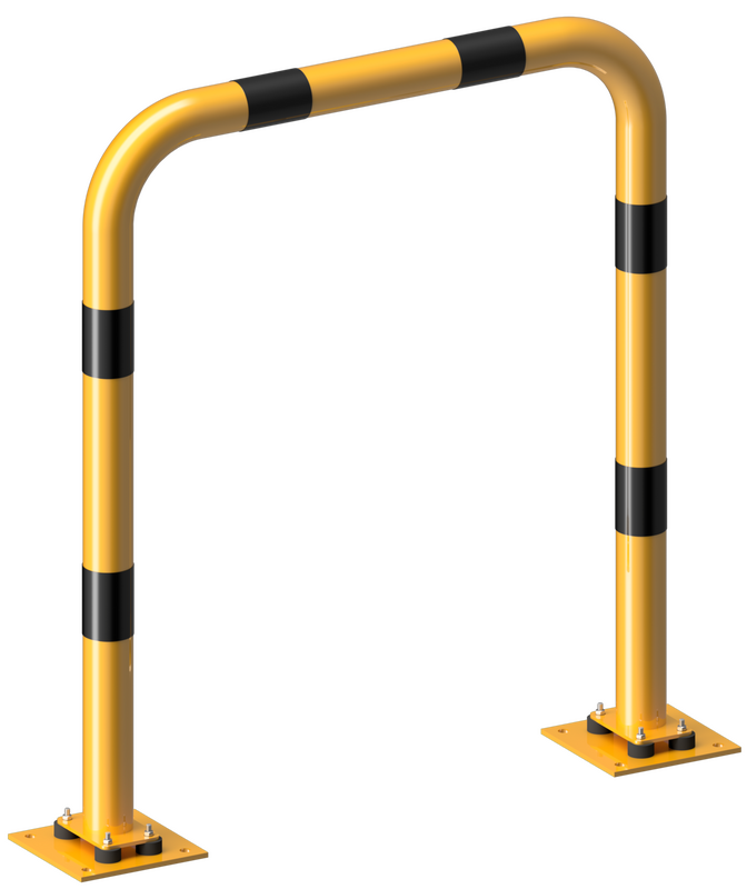 Bügel mit Bodenplatte 220 x 220 mm, feuerverzinkt, gelb pulverbeschichtet, mit schwarzen Warnstreifen.