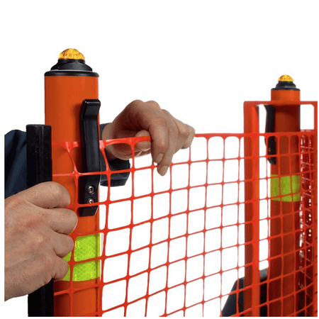 Die Sicherheitszone wird komplett mit einem 100''-Zaun in "Sicherheitsorange", 4 Pfosten, 4 Gummibasen und 4 magnetischen Klemmen zur Montage geliefert.