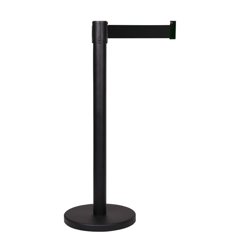 Unser FlexiBarrier-Gurtpfosten -Eco- hat eine silberne Oberfläche und wird mit einem 2 Meter langen einziehbaren Gurt in Schwarz, Rot oder Blau geliefert.