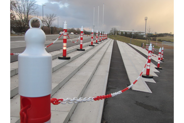 - Die 1200mm Pfostenkettenbarriere mit Ø 110mm kommt mit einer runden, beschwerten Basis für verbesserte Stabilität an stark frequentierten oder windigen Standorten.