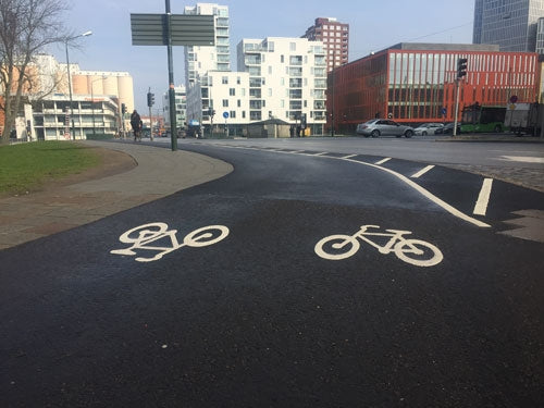 Neuinstallation von Straßenmarkierungen. PREMARK® ist ein vorgefertigtes thermoplastisches Straßenmarkierungsprodukt, das