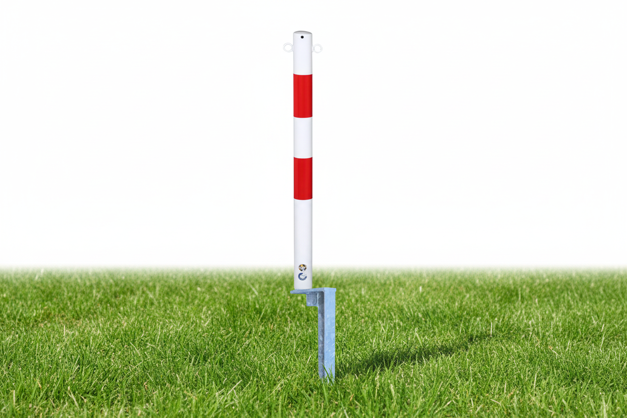 Hergestellt aus verzinktem Stahl und ausgestattet mit integrierten Kettenösen, ist dieser Poller ideal für temporäre oder halbpermanente Kettenbarrieren in Außenbereichen.